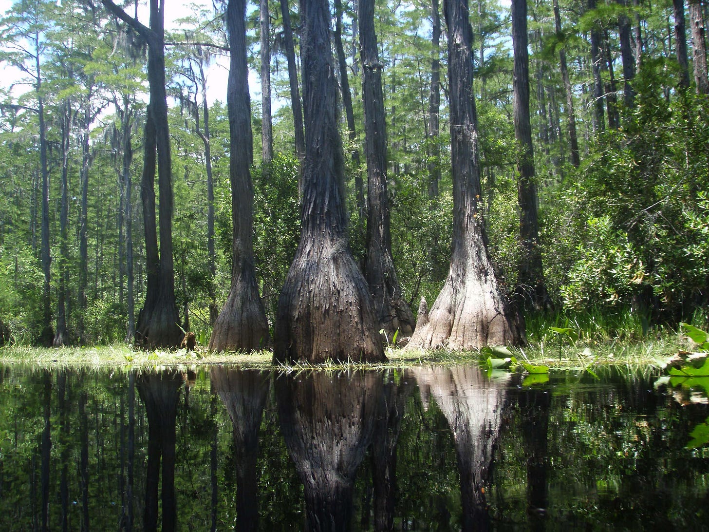 The bald cypress (Taxodium distichum) stands in black water, knees rising like ancient knuckles, trunks thickening with age. Needles emerge neon green in spring, turn rust in fall, and drift into the black water. Then the cycle repeats, beginning again with spring-green. The cypress does not ask permission. It does not apologize for thriving. Its knobby knees rise from the muck and goo. It simply obeys the oldest command: be fruitful and multiply.